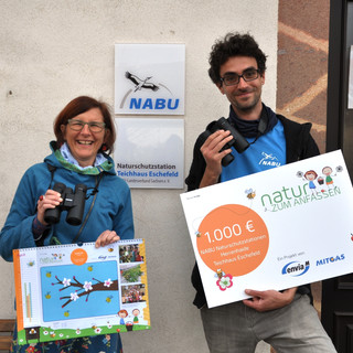 Janine Kirchner und Philipp Wöhner von der NABU Naturschutzstation Teichhaus Eschefeld freuen sich über vier hochwertige Ferngläser. „Damit können wir anstehende Exkursionen mit den Schulklassen und die ‚Natur zum Anfassen’-Projekttage im Sommer bereichern. Mit der Spende gibt es auf den Naturwanderungen rund um die Eschefelder Teiche noch mehr zu entdecken und zu beobachten“, sagt Wöhner.